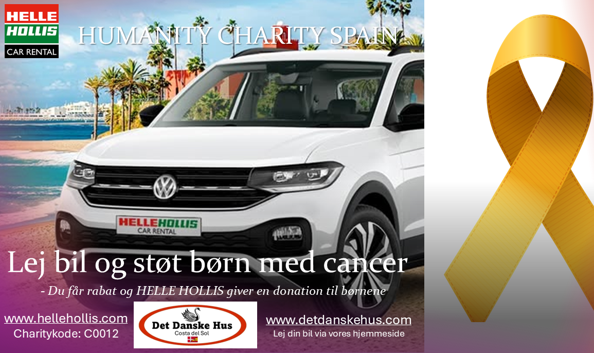 Det Danske Hus - Costa del Sol har en aftalen med HELLE HOLLIS - hvor du spare penge på billeje og HELLE HOLLIS giver en donation til børn med cancer - anvende kode: C0012 & få rabat.